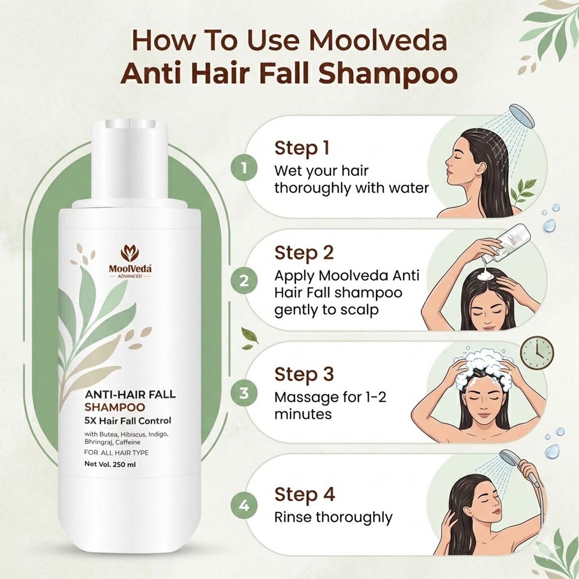 Moolveda Anti Hair Fall Shampoo is a powerful Ayurvedic + Advanced Science blend enriched with Kesudo, Jasud, Neeli, Bhringraj, Amla, Shikakai and Caffeine to deeply strengthen hair from roots, reduce breakage and stimulate hair growth. Infused with Rosemary Oil and nourishing natural extracts for thicker, smoother, and healthier-looking hair. Suitable for all hair types and safe for daily use.