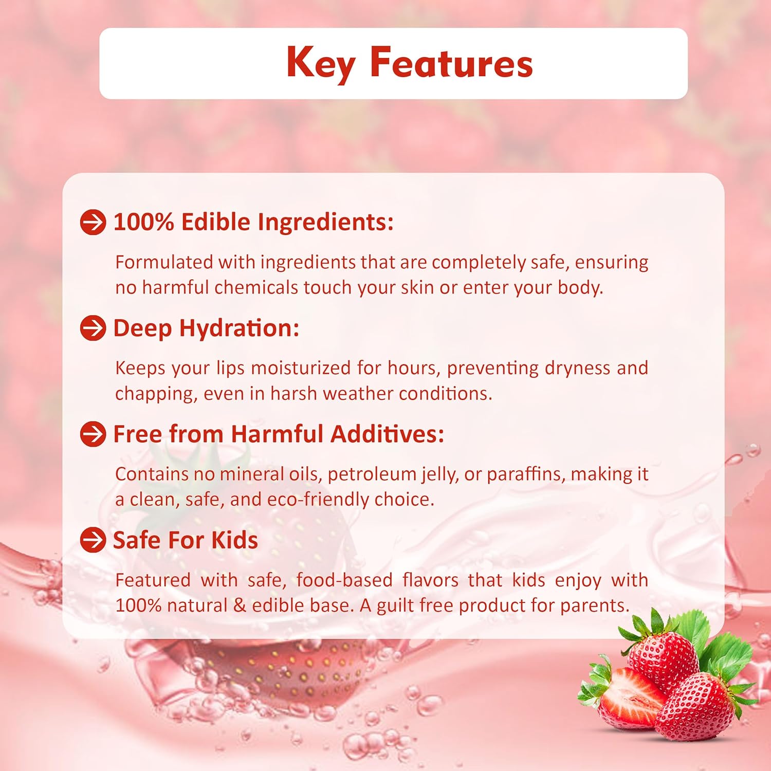 - Strawberry Extract Goodness – rich in antioxidants to protect and rejuvenate lips.